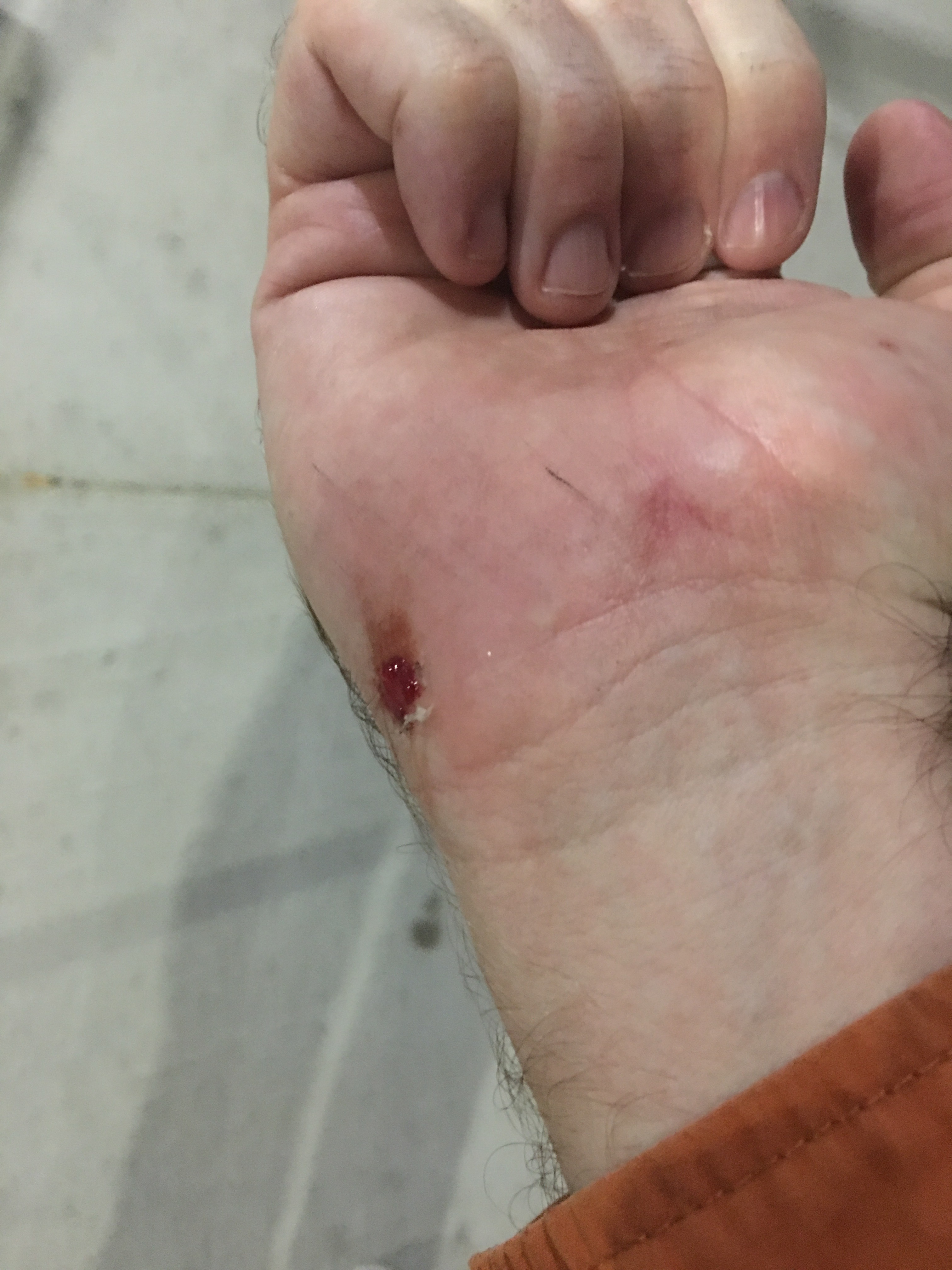 I fall forward. My right arm and palm heel (see Picture 2) brake the fall. I roll off over my right shoulder hearing the clatter of my phone on the concrete. I’m worried I might frak up my phone again, but my fairly thick case did its job this time around probably because high-impact phone cases are designed to handle glancing rolling hits better than straight drops. And so I sit up, delete the stupid Type n Walk app from my phone, shake it off and get walking again. Basically, I’m young enough where I can fall, not break anything, avoid hitting my head and then walk it off. Who knows about next time?